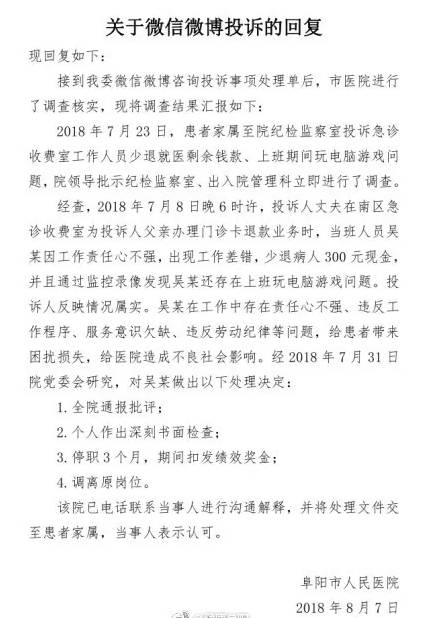经查,2018年7月8日晚6时许,投诉人丈夫在南区急诊收费室为投诉人父亲办理门诊卡退款业务时,当班人员吴某因工作责任心不强,出现工作差错,少退病人300元现金,并且通过监控录像发现吴某还存在上班玩电脑游戏问题。投诉人反映情况属实。吴某在工作中存在责任心不强、违反工作程序、服务意识欠缺、违反劳动纪律等问题,给患者带来困扰损失,给医院造成不良社会影响。经2018年7月31日院党委会研究,对吴某做出以下处理决定:
