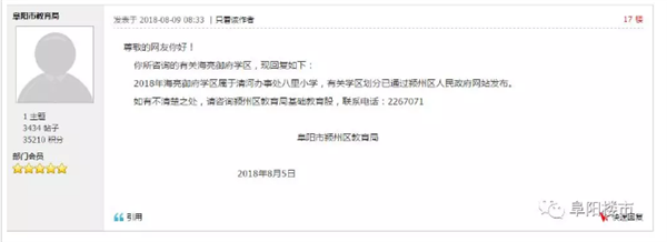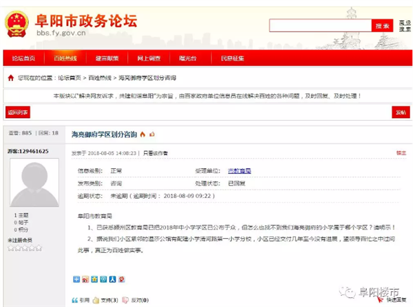 近日,有网友在阜阳市政务论坛发帖咨询海亮御府学区问题: