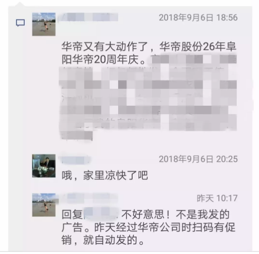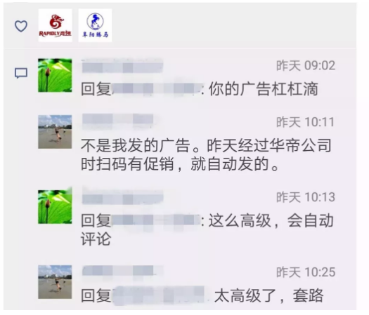 近日,阜城市民赵先生告诉我们6号他从阜城西站附近经过,由于不熟悉路,刚好路边正好站着一群人,赵先生就上前问路,刚问完路,其中一名30多岁的女子拉住赵先生:“我们是华帝公司的,你扫一下二维码吧,还能送个杯子。赵先生本想拒绝,但毕竟别人刚给指了路,碍于情面不好推辞。扫个二维码能有什么?虽然不太情愿,赵先生还是扫了。接下来,意想不到的事情发生了。7号一早,赵先生打开朋友圈,发现有几百条一模一样广告回复信息。赵先生说这都不是他发的,都是自动发的。