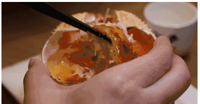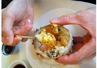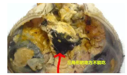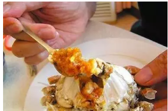 3、先吃蟹盖部分,用小勺把中间的蟹胃部分舀出,轻轻将外面包裹着的蟹黄吮干净。注意,不要吮破中间那个呈三角锥形的蟹胃,应将其丢弃。