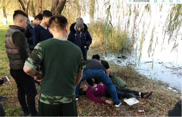成功将女子救上岸后,一名消防员清理女子口中的异物,热心群众拿来棉衣给她保暖,并利用水桶让抬高女子腹部,拍打后背进行急救。